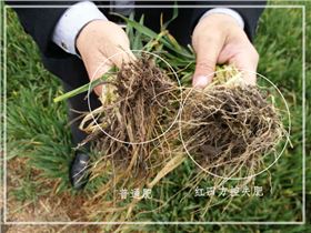 在周大叔家里坐了一小会,跟他拉拉家常并解答一些周大叔的种植疑难问题后,大家一同前往周大叔的小麦地里,检查小麦长势。麦苗绿油油的,长势均匀,没有缺肥现象,同时周大叔拔出普通肥种植区小麦与控失肥种植区小麦,对比得出:施用控失肥小麦根系比普通肥小麦根系要密集、叶片深绿。