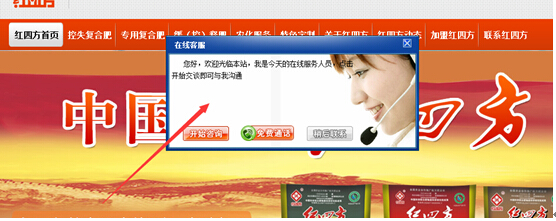 当您进入红四方复合肥网,可能很快就会跳出一个对话框(如图一),您一定不要烦哦!这是我们的客服美眉主动跟您打招呼。这个对话框您可以点击开始咨询,可以跟我们的客服美眉对话了。这里你可以了解桉树种植技术,红四方桉树专用肥料知识等等,这里客服美眉都在等候您的佳音哦!